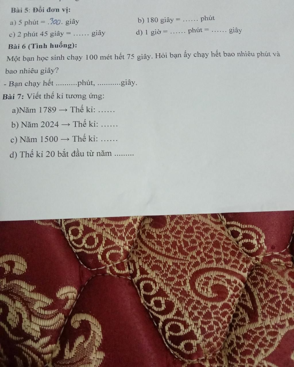 `a)` Đổi `5` phút `= 5 xx 60 = 300` giây