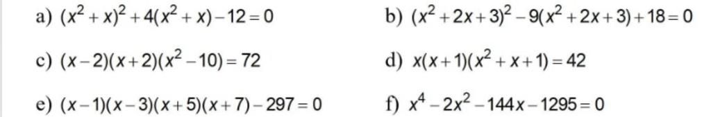 `a) ( x^2 + x )^2 + 4( x^2 + x ) - 12 = 0`
