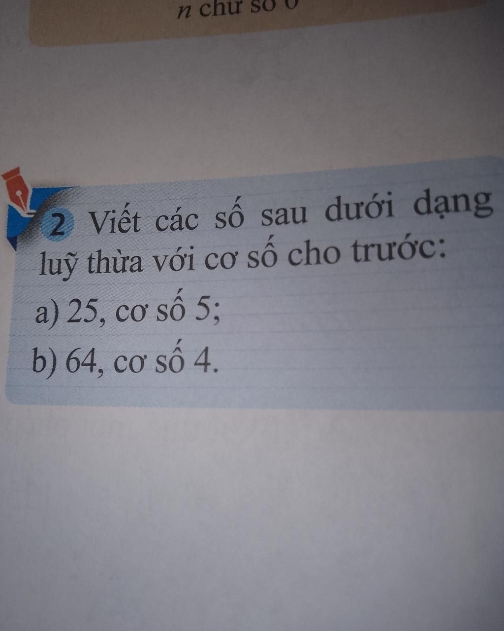 Vậy số `25` viết dưới dạng lũy thừa với cơ số cho trước là `5^2`
