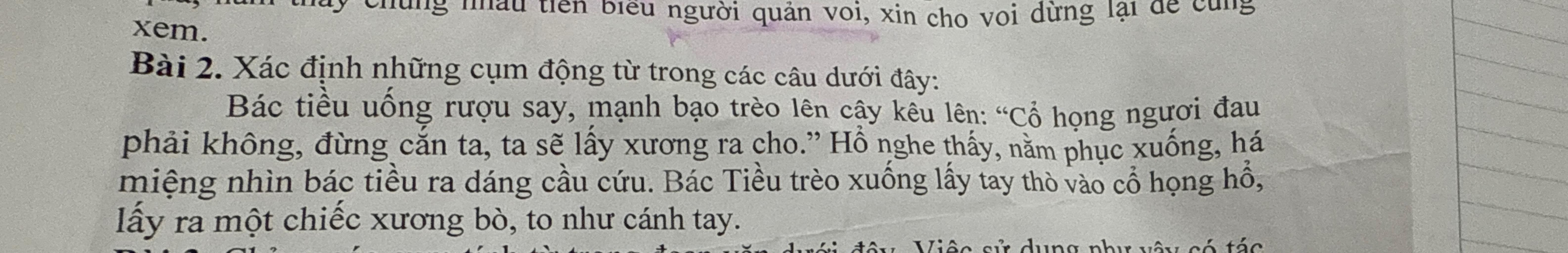 Cụm động từ: uống rượu say, trèo lên cây, đừng cắn ta, lấy xương ra cho, nằm phục xuống,há miệng nhìn bác tiều ra dáng cầu cứu, thò tay vào cổ họng hổ, lấy ra một chiếc xương bò