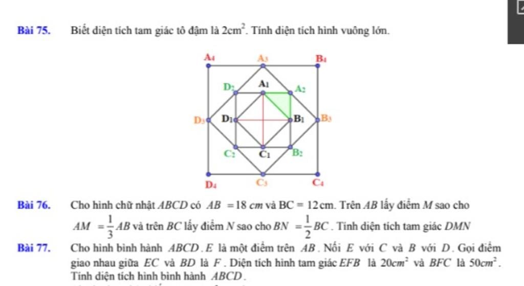 Biết diện tích tam giác tô đậm là 2cm”. Tính diện tích hình vuông lớn.