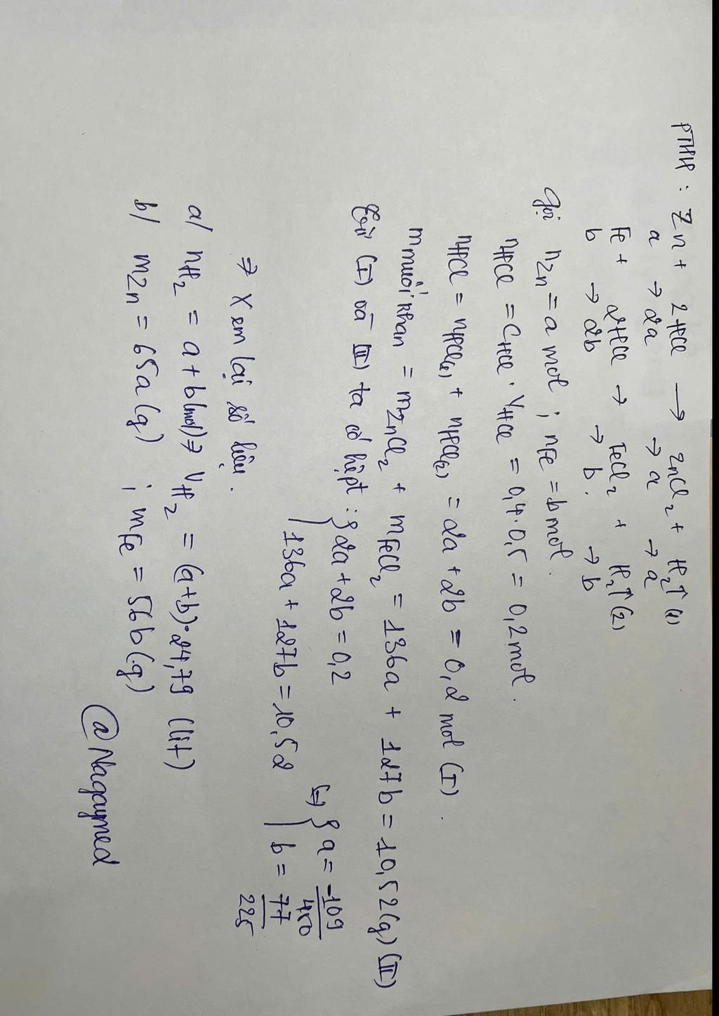 Hòa tan hoàn toàn hỗn hợp ( zn, fe ) trong 500 ml dung dịch HCL. Nồng độ 0,4 M. thu được 10,52g muối khan và V lít khí H2 ( điều kiện chuẩn ) a) tính Vh2 b) tính khối lượng mỗi kim loại hỗn hợp ban đàu