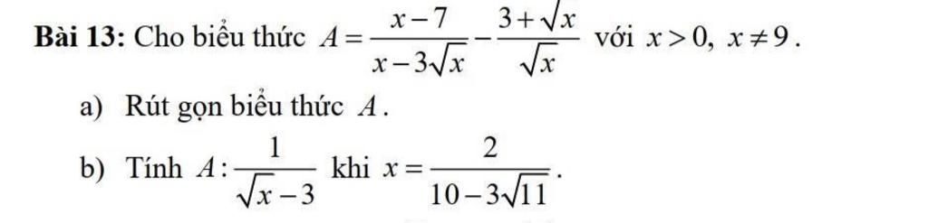 `A = ( x - 7 )/(x - 3\sqrt{x} ) - ( 3 + \sqrt{x} )/(\sqrt{x})`