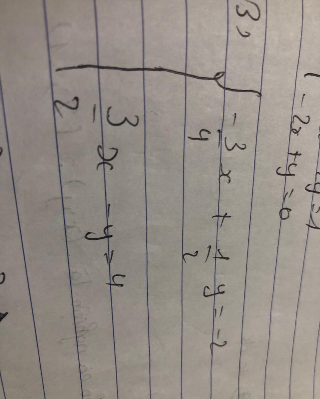 `<=> {( -3/4 x + 1/2y = -2 ),( 3/4 x - 1/2 y = 2 ):}`