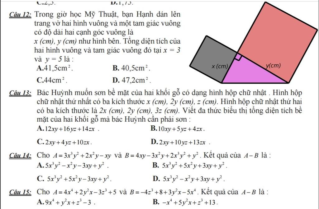 x (cm), y (cm) như hình bên. Tổng diện tích của
