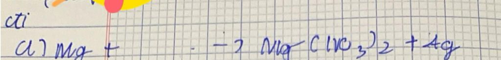a) `Mg +` ... `->` `Mg``(NO_3)_2` `+Ag`