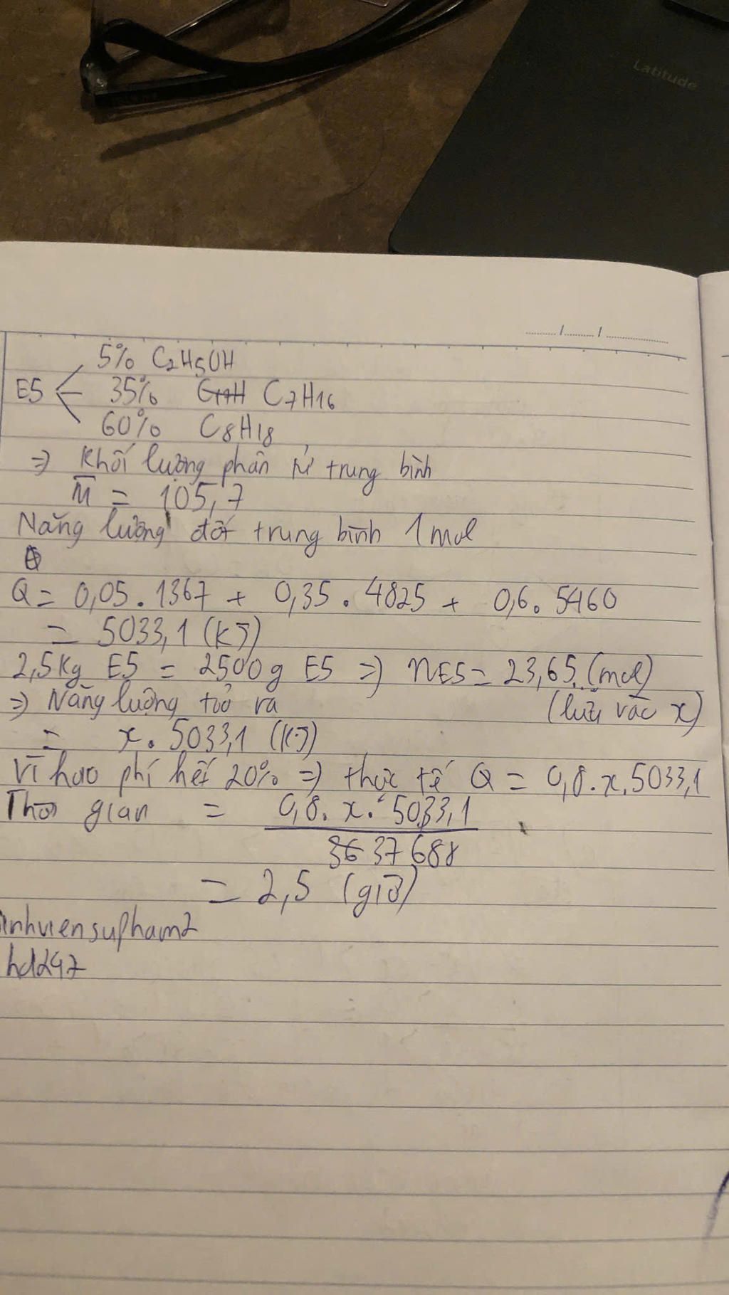 Ta có: `Q_t = 0,05axx1367+0,35axx4825+0,6axx5460=119042,1003(kJ)`
