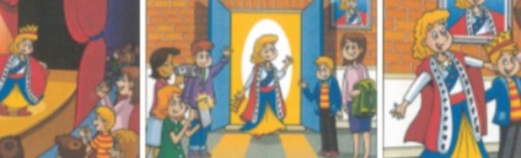This picture is about a school play. In the first picture, a boy is on the stage. He wears a crown and a red cape. He looks like a king. Many children watch him and clap. In the second picture, the boy walks in the school. He is still wearing the costume. Other children smile and take photos of him. In the last picture, the boy talks to a friend. He is happy and proud. The teacher is also smiling. Everyone enjoys the play and has a good time together. It is a fun and happy day at school.