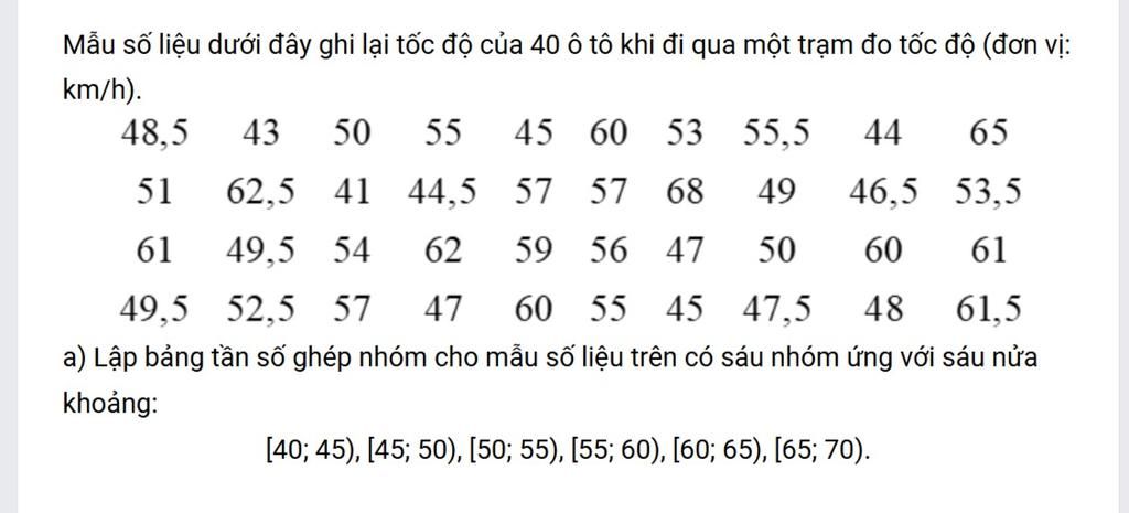 Mẫu số liệu dưới đây ghi lại tốc độ của 40 ô tô khi đi qua một trạm đo tốc độ (đơn vị:
