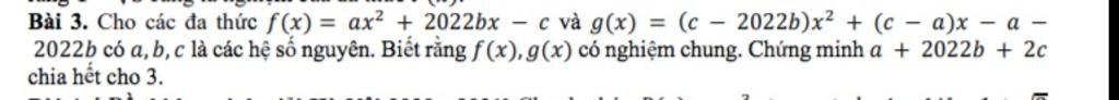 2022b có a, b, c là các hệ số nguyên. Biết rằng f (x), g(x) có nghiệm chung. Chứng minh a + 2022b + 2c
