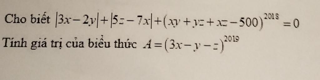 Mà `|3x-2y| + |5z-7x| + (xy+yz+xz-500)^2018 = 0` (Theo đề bài)