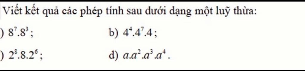 `a) 8^7 * 8^3 = 8^(7+3) = 8^10`