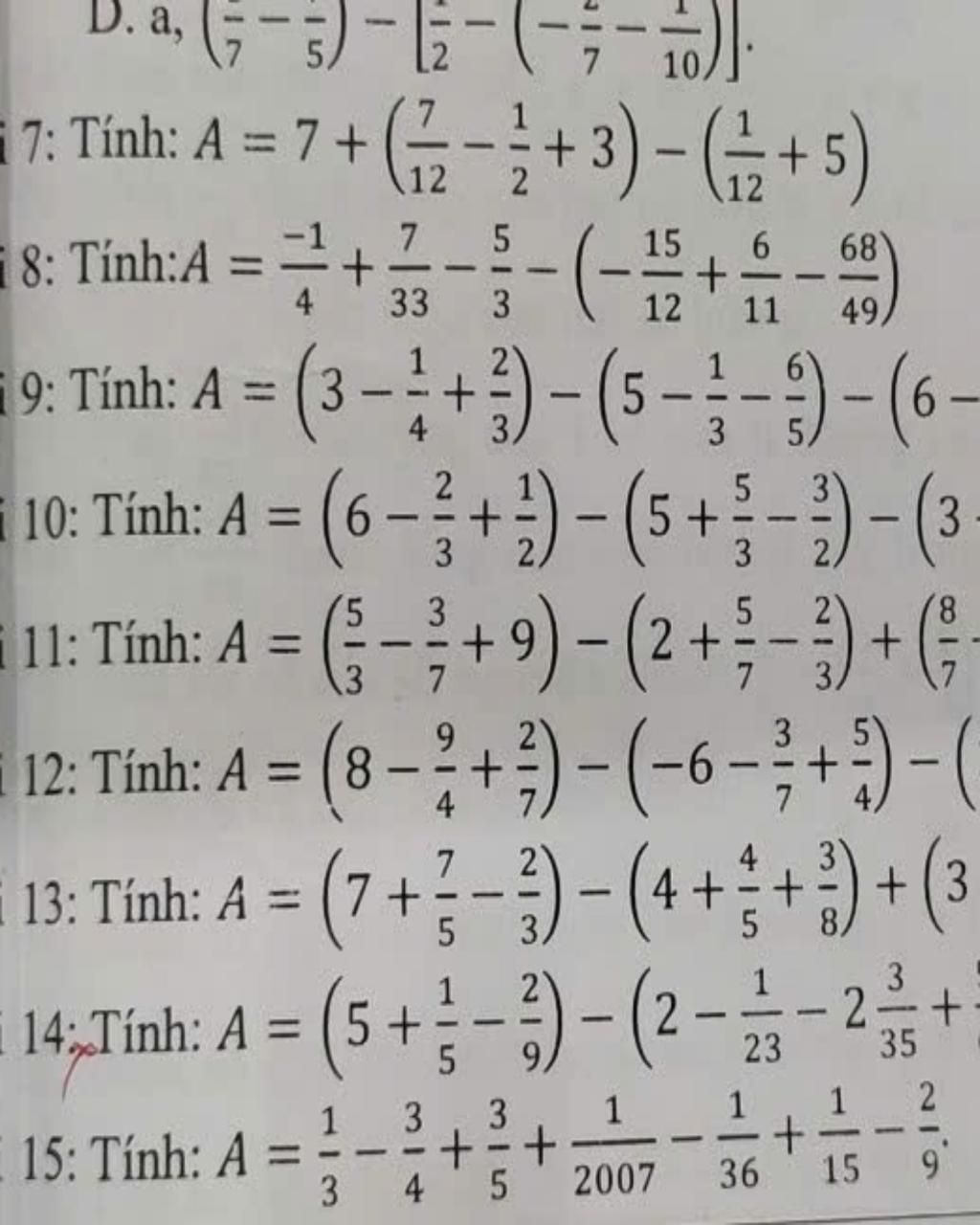 Câu 15 : `A =` `1/3` `-` `3/4` `+` `3/5` `+` `1/2007` `-` `1/36 ``+ ``1/15` `-` `2/9`
