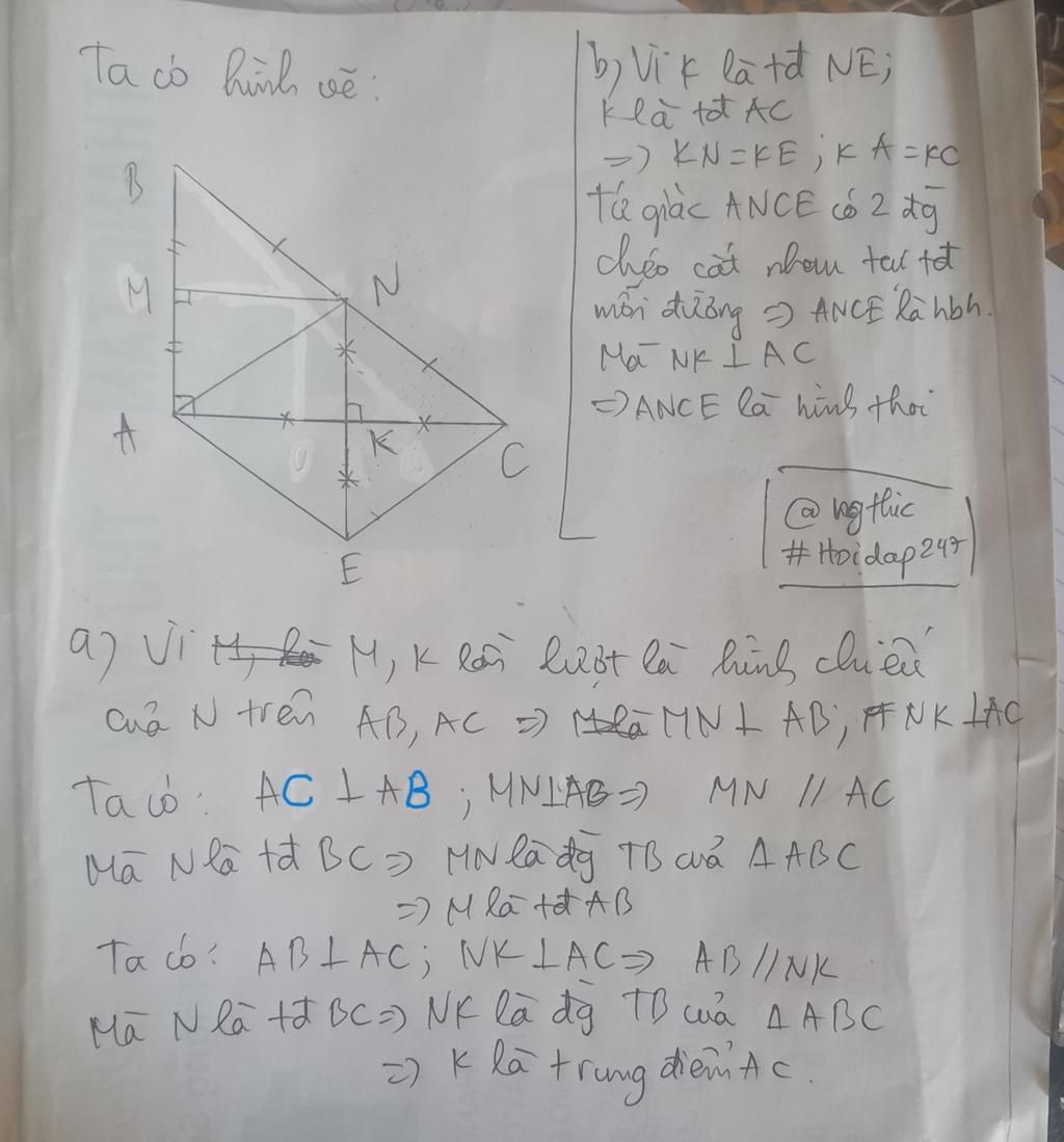 bài 2 cho tam giác abc vuông tại a có ab ac. gọi n là trung điểm bc. gọi m,p lần lượt là hình chiếu của N trên AB,AC . lấy E sao cho k là trung điểm