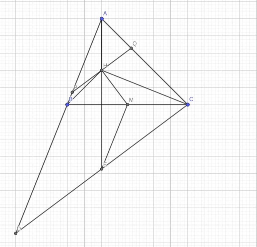 Cho tam giác ABC có 3 góc nhọn, trực tâm H. Một đường thẳng đi qua H cắt AB, AC theo thứ tự Q, P sao cho HP = HQ. Gọi M là trung điểm BC. Chứng minh rằng HM vuông góc PQ