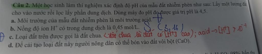`a)` Đúng, đất nhiễm phèn là đất chua nên có tính acid
