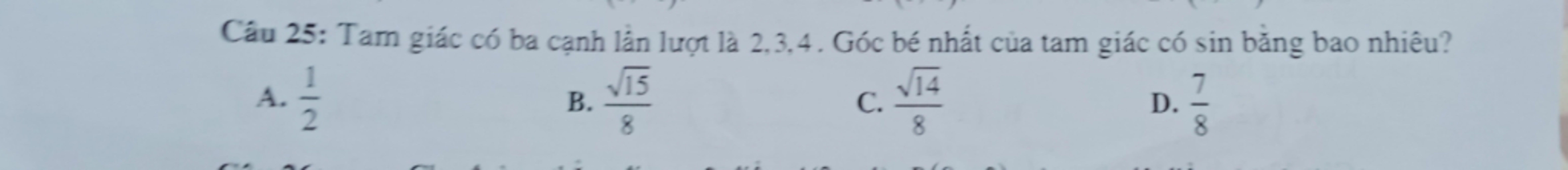 \cos a = \frac{{{3^2} + {4^2} - {2^2}}}{{2.3.4}} = \frac{7}{8}\\