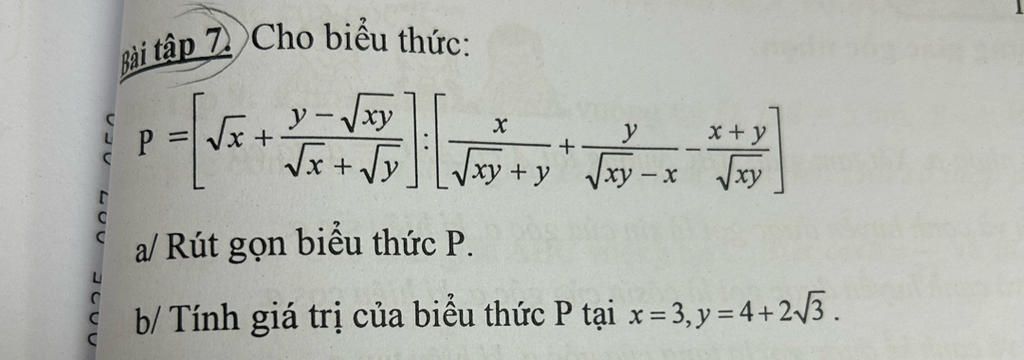 $P=\dfrac{x+\sqrt{xy}+y-\sqrt{xy}}{\sqrt{x}+\sqrt y}):(\dfrac{x}{\sqrt y(\sqrt x+\sqrt y)}+\dfrac{y}{\sqrt x(\sqrt y-\sqrt x)}-\dfrac{x+y}{\sqrt{xy}})$