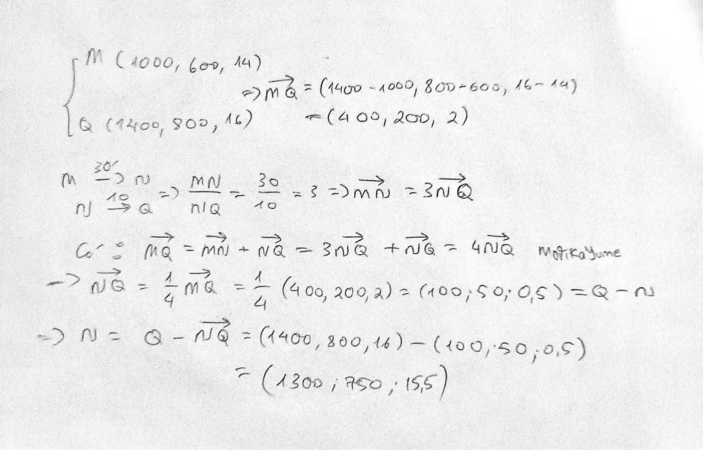 Trong không gian hệ trục toạ độ cho trước, đơn vị đo lấy kilômét, ra đa phát hiện một máy bay chiến đấu của Mỹ di chuyển với tốc độ và hướng không đổi từ điểm M (1000;600;14) đến điểm N trong 30 phút. Nếu máy bay tiếp tục giữ nguyên vận tốc và hướng bay thì toạ độ của máy bay sau 10 phút tiếp theo bằng Q (1400;800;16). Xác định toạ độ vị trí điểm N.