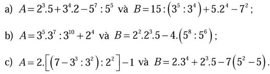 `a)` `A = 2^3 . 5 + 3^4 . 2 - 5^7 : 5^5`