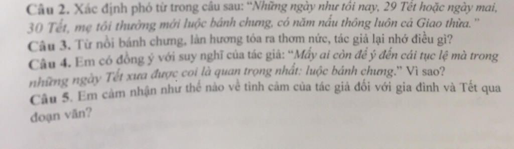 Câu `5:` Tác giả có tình cảm yêu thương, biết ơn mẹ, trân trọng gia đình, hoài niệm và nâng niu Tết truyền thống, mong giữ gìn nét đẹp ấy.