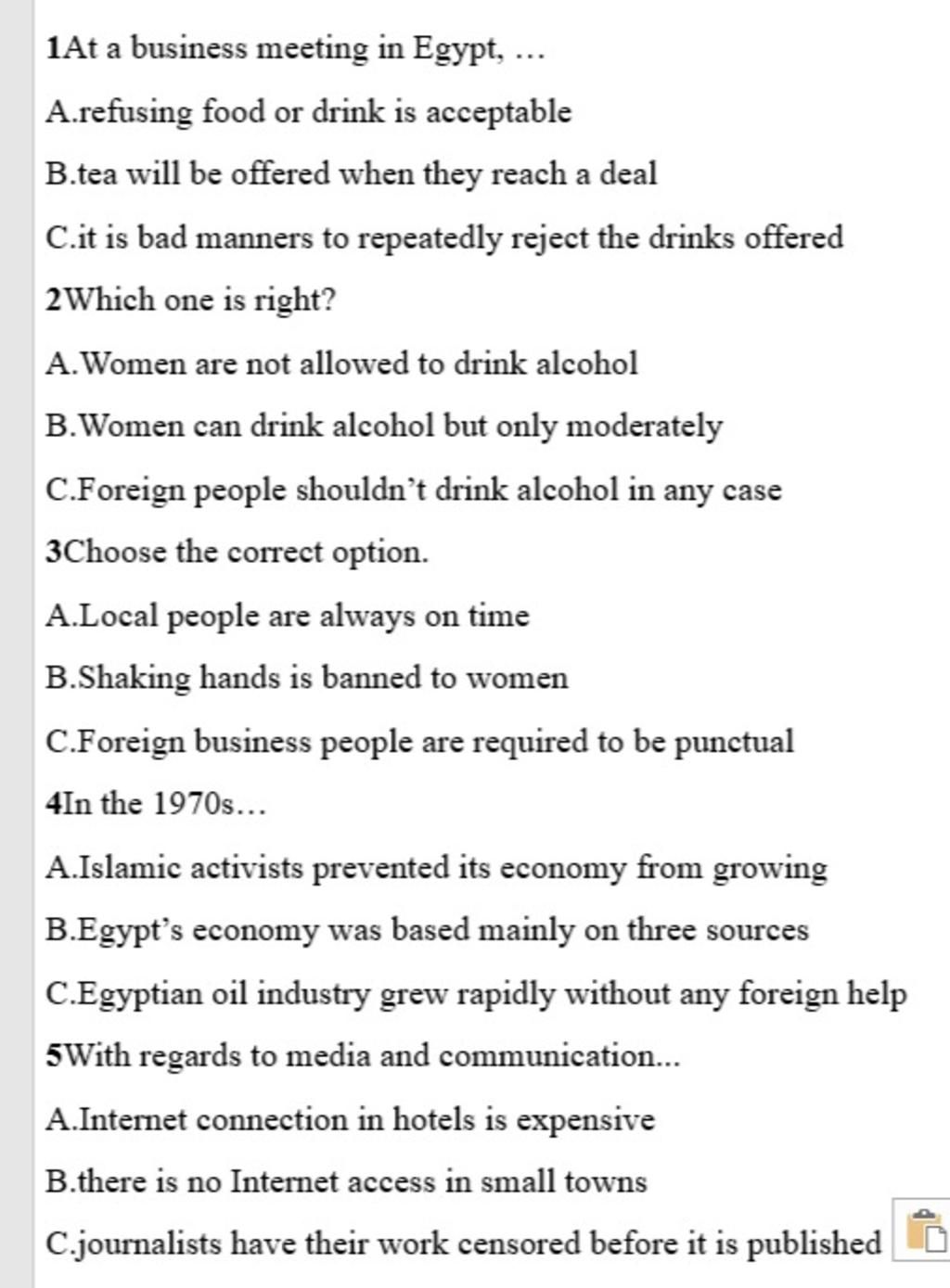 1.“It’s polite to refuse the first offer, but once the host insists, the guest should then accept.” 2.“Alcohol is legal, but should be avoided until visitors know their Egyptian colleague’s attitude towards drinking, and, if acceptable, should be drunk in moderation. It is not considered suitable for women to over-indulge in alcohol.” 3.“For business, visitors should be on time but expect locals to be often late, and do not take offence.” 4.“Egypt’s economy underwent rapid growth during the 1970s with the quick expansion of the oil industry, tourism and the Suez Canal.” 5.“Tourists can also access the Internet in hotels, with in-room Wi-Fi available, though often at a costly price.” Rút gọn1.“It’s polite to refuse the first offer, but once the host insists, the guest should then accept.” 2.“Alcohol is legal, but should be avoided until visitors know their Egyptian colleague’s attitude towards drinking, and, if acceptable, should be drunk... xem thêm