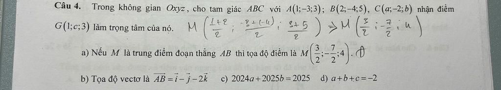 Mà `A(1; -3; 3), B(2; -4; 5), C(a; -2; b), G(1; c; 3)`