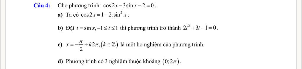 Câu 4: Cho phương trình: `cos2x-3sinx-2=0`