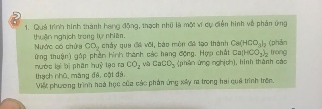 (1) Nước có chứa CO₂ (tạo H₂CO₃) ăn mòn đá vôi (CaCO₃) tạo muối canxi hydrocacbonat hòa tan — phản ứng thuận (hình thành Ca(HCO₃)₂):