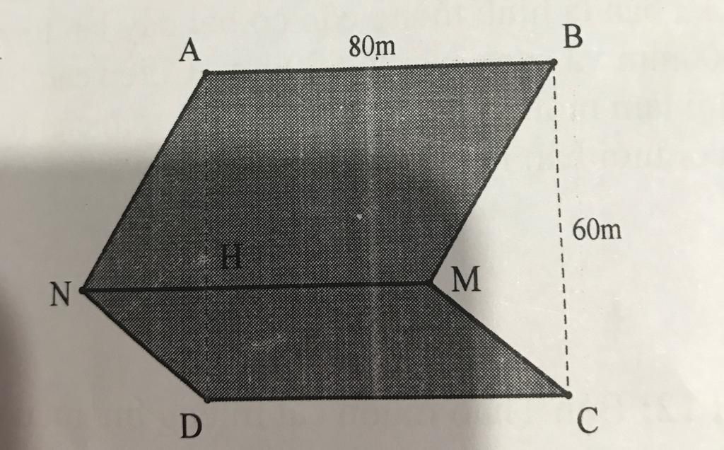Bài 5: Một mảnh vườn có dạng như hình vẽ bên dưới. Để tính diện tích mảnh vườn,người ta chia nó thành hai hình bình hành ABMN và CDNM có kích thước như sau:AB=MN=CD=80m. Biết ABCD là hình chữ nhật có BC=60m. Hãy tính diện tích mảnh vườn này.