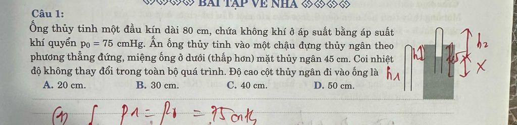 Gọi độ cao cột thủy ngân đi vào ống là \({h_2}\left( {cm} \right)\). ĐK: \({h_2} \le 45\left( {cm} \right)\)
