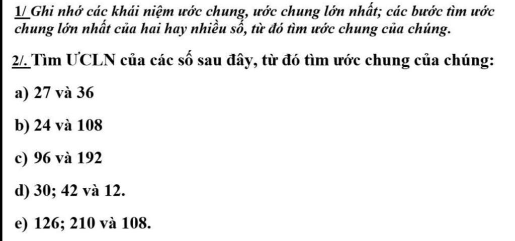 e) Ta có : GCD(126,210,108)=6 Suy ra ƯC(126,210,108)=Ư(6)