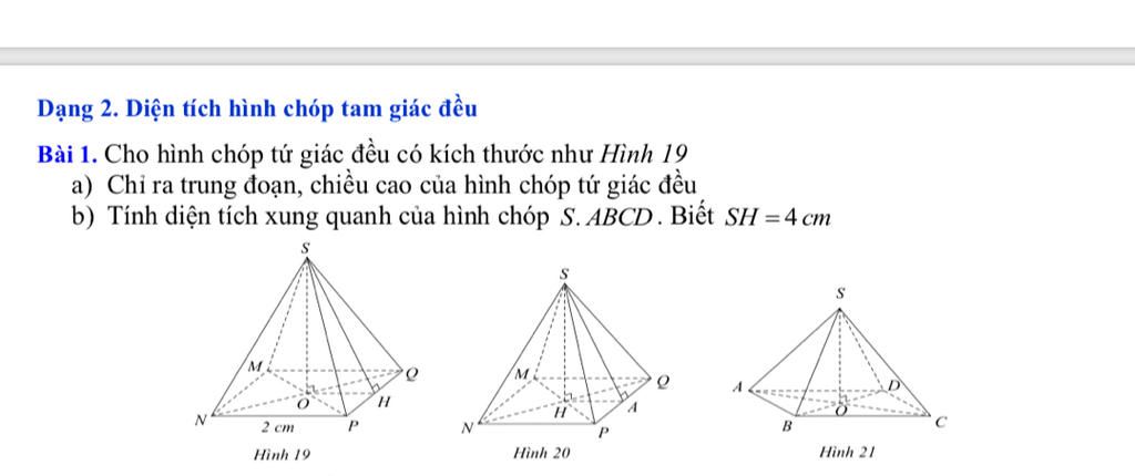 Bài 1. Cho hình chóp tứ giác đều có kích thước như Hình 19