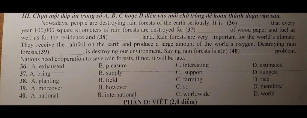 `@` Phía trước nói "rừng rất quan trọng", sau đó chuyển ý "tuy nhiên, con người vẫn phá hủy" → S + V , therefore, S + V....