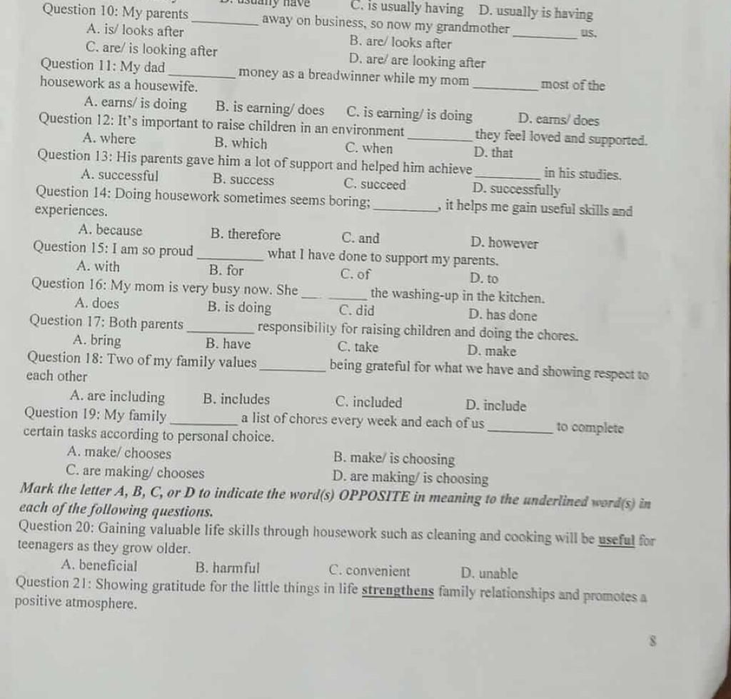 Question 14: Doing housework sometimes seems boring; ______, it helps me gain useful skills and experiences.