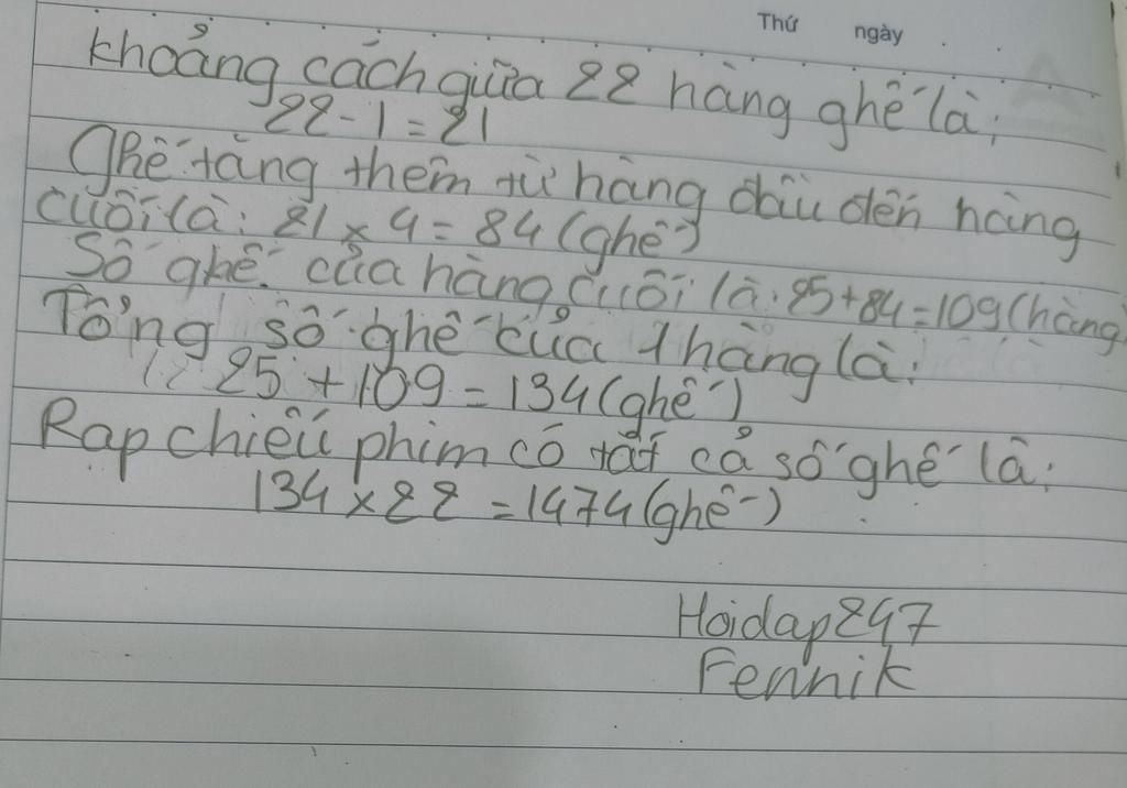Số khoảng cách giữa `22` hàng ghế là: `22−1=21` `(`khoảng cách`)`