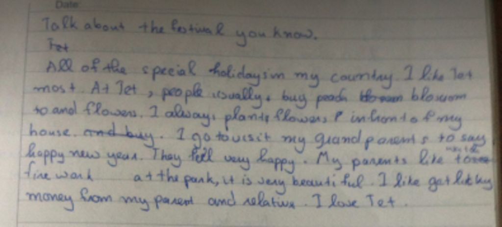 Tet is a national and family festival. It is an occasion for every Vietnamese to have a good time while thinking about the last year and the next year. At Tet, spring fairs are organized, streets and public buildings are brightly decorated and almost all shops are crowded with people shopping for Tet. At home, every is tidied, special food is cooked, offerings of food, fresh water, flowers and betel are made on the family altar with burning joss- sticks scenting the air. First-footing is made when the lucky visitor comes and children are given lucky money wrapped in a red tiny envelope. Tet is also a time for peace and love. During Tet, children often behave well and friends, relatives and neighbors give each other best wishes for the new year.