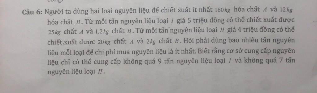 Từ mỗi tấn nguyên liệu loại I, chiết xuất được `1,2kg` chất B, từ mỗi tấn nguyên liệu loại II, chiết xuất được `2kg` chất B và người ta cần chiết xuất ít nhất `12kg` chất B
