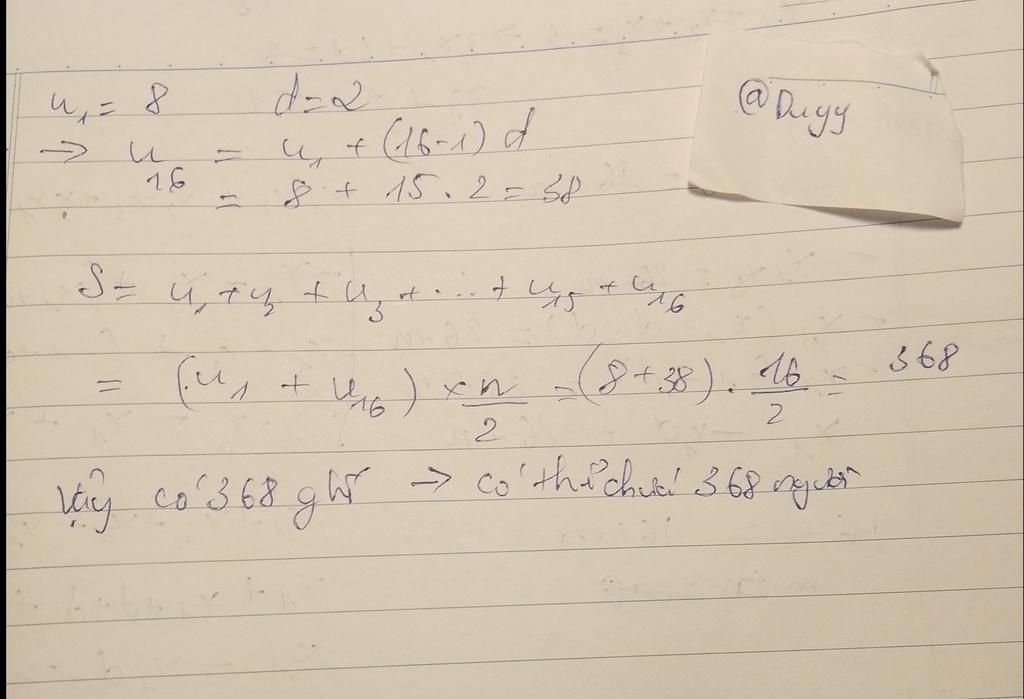 Câu 15. Khán đài A của một sân bóng có 16 hàng ghế. Biết hàng ghế đầu tiên có 8 ghế, mỗi hàng sau nhiều hơn hàng trước 2 ghế. Hỏi khán đài A của sân bóng chứa được bao nhiêu người biết rằng mỗi người chỉ ngồi 1 ghế.