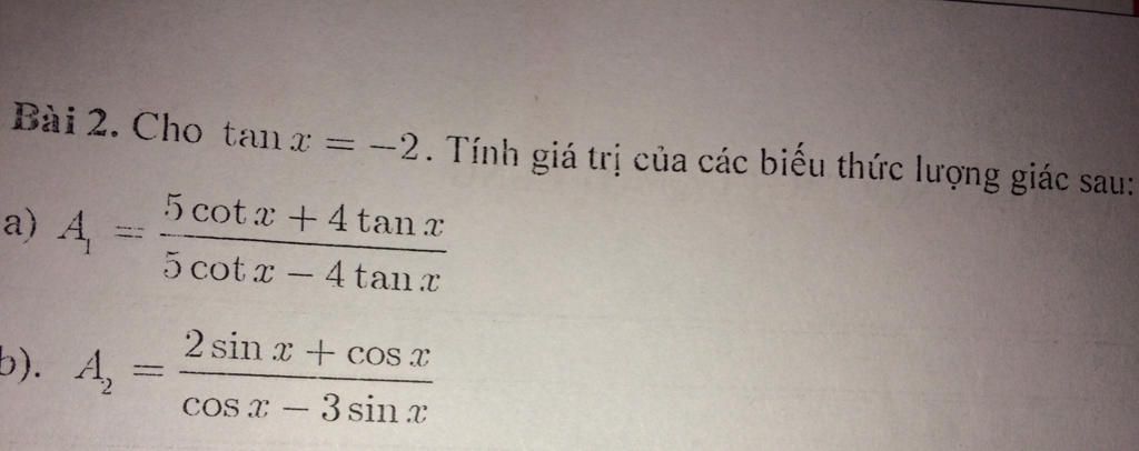 {A_2} = \frac{{2\sin x + \cos x}}{{\cos x - 3\sin x}} = \dfrac{{\frac{{2\sin x + \cos x}}{{\cos x}}}}{{\frac{{\cos x - 3\sin x}}{{\cos x}}}} = \dfrac{{2\frac{{\sin x}}{{\cos x}} + 1}}{{1 - 3.\frac{{\sin x}}{{\cos x}}}} = \frac{{2\tan x + 1}}{{1 - 3\tan x}} = \frac{{2.\left( { - 2} \right) + 1}}{{1 - 3.\left( { - 2} \right)}} = \frac{{ - 3}}{7}