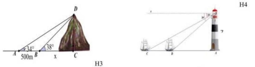 Tính chiều cao của một ngọn núi (H3). (Kết quả làm tròn đến hàng đơn vị), biết tại hai điểm A, B cách nhau 500m, người ta nhìn thấy đỉnh núi với góc nâng lần lượt là 34° và 38°, D H4