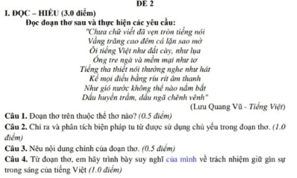 Câu 4 Tiếng Việt chính là nét đặc trưng riêng của dân tộc Việt Nam ta vì thế ta giữ gìn cái đạp của tiếng việt chính là giữ gìn bản sắc dân tộc ta