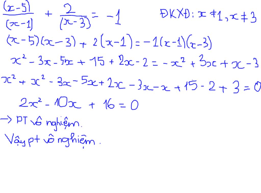 `(x-5)/(x-1)+2/(x-3)=-1` `(ĐKXĐ : x ne 1 ; x ne 3)`