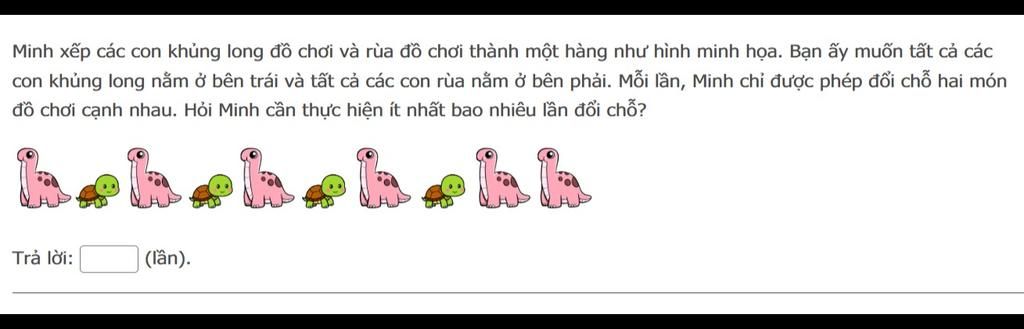 Con rùa thứ ba: Có 3 con khủng long bên phải nó. $\rightarrow$ Cần 3 lần đổi chỗ.