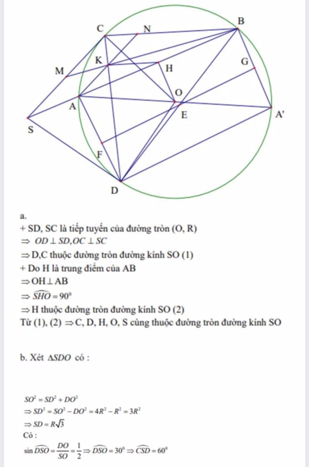 2) Khi SO = 2R, hãy tính độ dài đoạn thẳng SD theo R và tính số đo ∠CSD