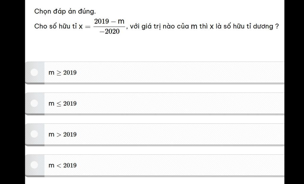 `2019-m<0`, vì nếu tử số là số âm, mẫu số là số âm `->` giá trị phân số sẽ thành dương