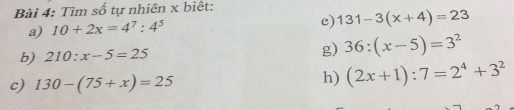 `a)` `10+2x=4⁷:4⁵`