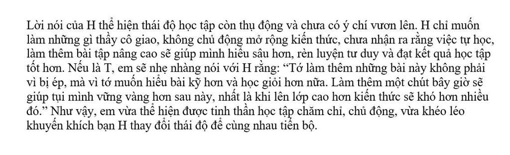 `->` Nếu là `T` em sẽ nói với `H` là làm thêm bài tập nâng cao giúp mình hiểu sâu hơn, nhớ lâu hơn và rèn luyện tư duy tốt hơn. Không chỉ làm cho thầy cô giao mà còn học để mở rộng hiểu biết, chuẩn bị cho tương lai sau này