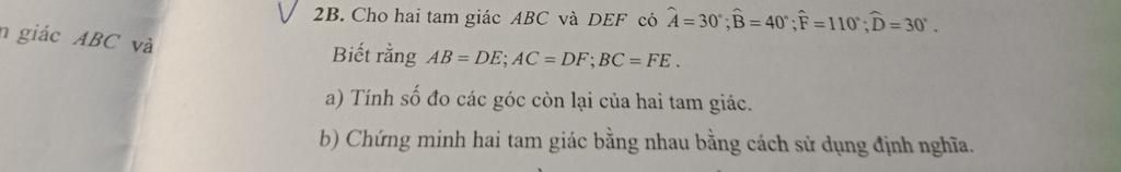 V2B. Cho hai tam giác ABC và DEF có A=30;B=40';F=110;D=30.