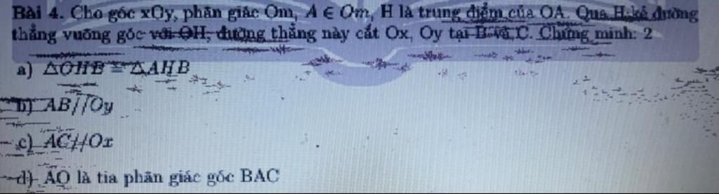 Bài 4. Cho góc xOy, phân giác Om, A e Om, H là trung điểm của OA. Qua H kẻ đường